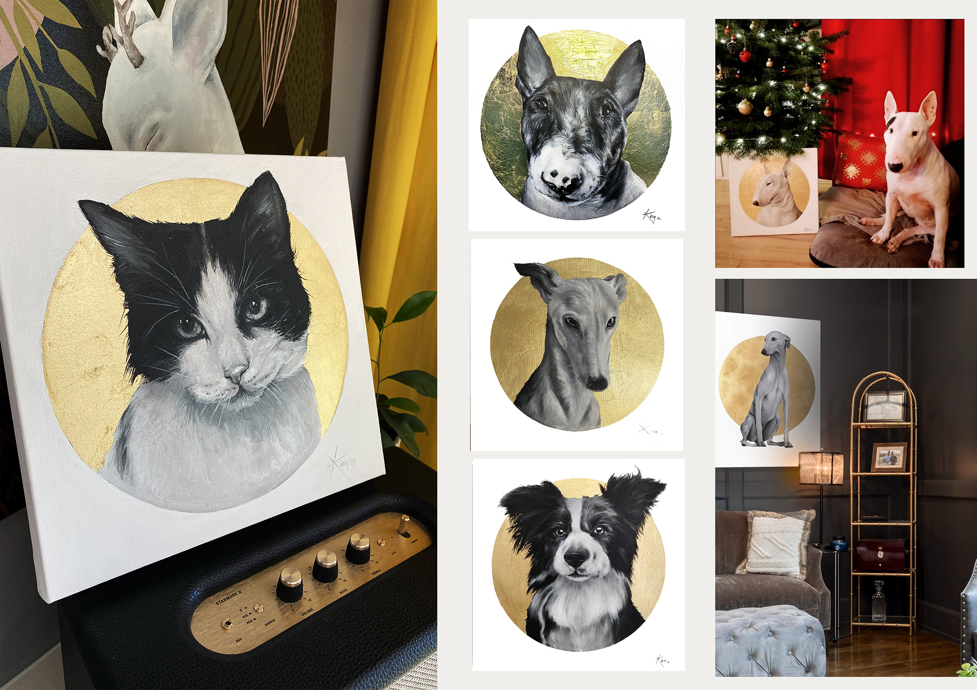 Zamów portret swojego zwierzaka lub obdaruj bliska ci osobę wyjątkowym prezentem. Wszystkie portrety są wykonane ręcznie w technice mieszanej farbami akrylowymi, olejnymi i złocone płatkami szlagmetalu na płótnie.